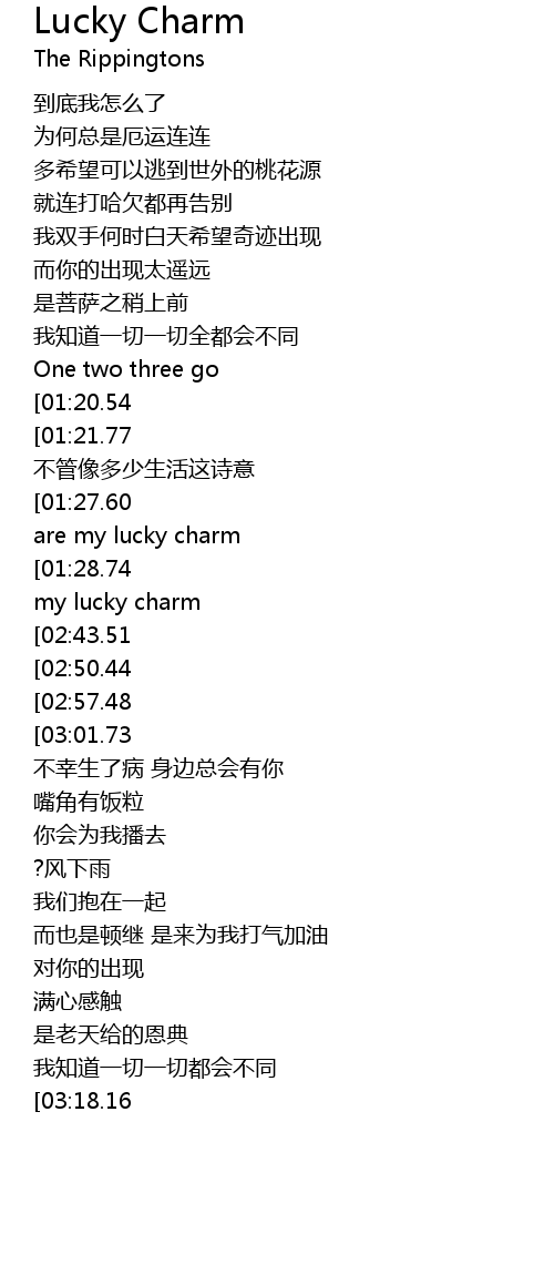| [01:15.00][01:28.74][02:34.83][02:48.72][02:55.76][03:16.60][03:30.58][03:37.34] | you're my lucky charm |