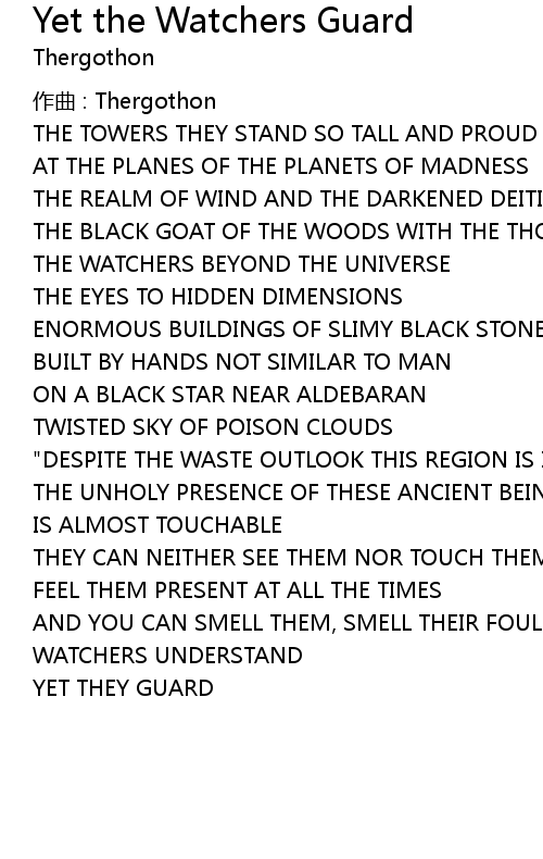 | Song | Yet the Watchers Guard |