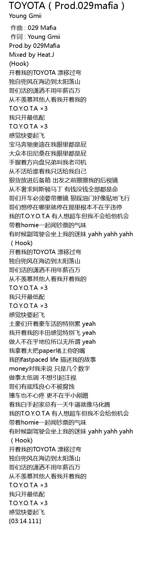 | [02:24.871] | 我的T.O.Y.O.T.A 有人想超车但我不会给他机会 |