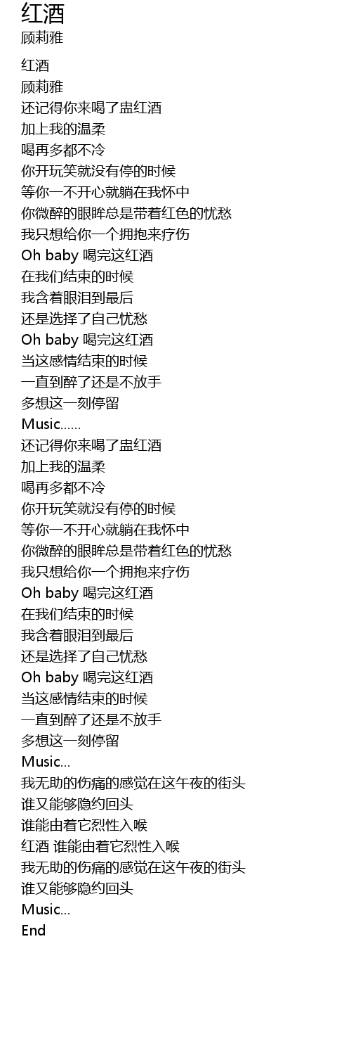 | [00:59.38] | Oh baby he wan zhe hong jiu |