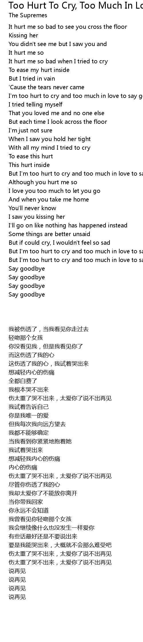 I'm too hurt to cry and too much in love to say goodbye |