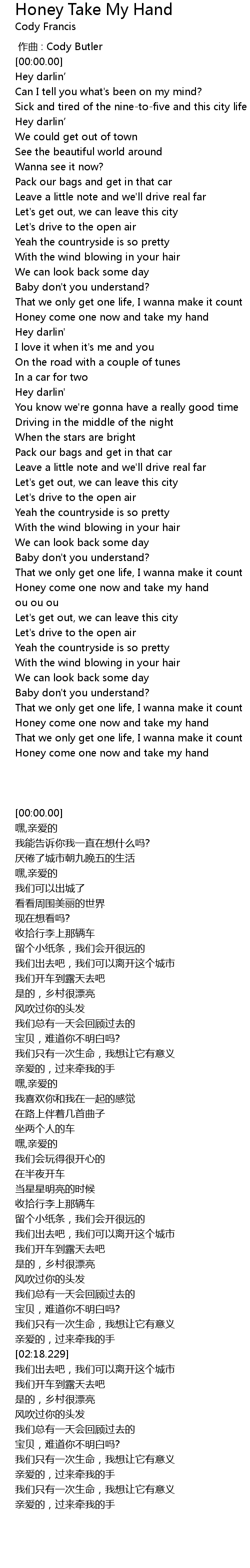 | [03:00.789] | Honey come one now and take my hand |