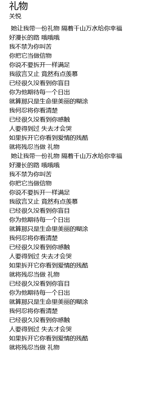 | [02:20.250] | 她让我带一份礼物 隔着千山万水给你幸福 |