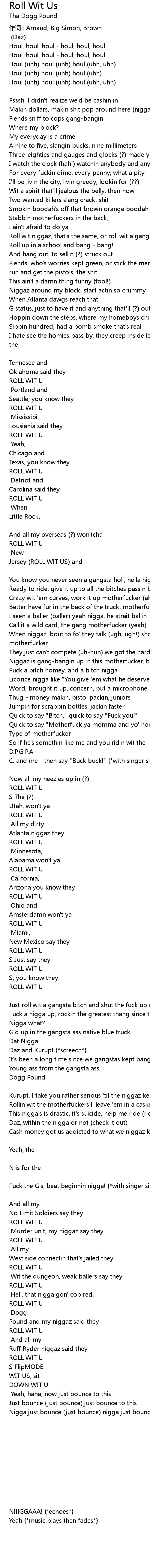 | Quick to say "Motherfuck ya momma and yo' hood too" (Nigga it's Tha Dogg Pound) | |