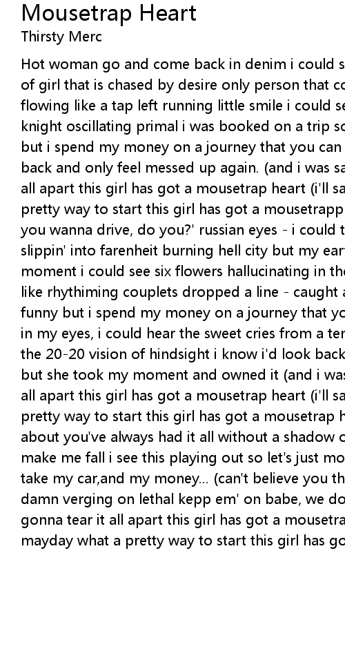 Hot woman go and come back in denim i could see that she was west end vemon kind of girl that is chased by desire only person that could get me higher blood flowing like a tap left running little smile i could see she's cunning white knight oscillating primal i was booked on a trip so final and it sounds so funny but i spend my money on a journey that you can depend on but i know i'd look back and only feel messed up again. (and i was saying) mayday she gonna tear it all apart this girl has got a mousetrap heart (i'll say it again) mayday what a pretty way to start this girl has got a mousetrapp heart... hot woman say 'do you wanna drive, do you?' russian eyes - i could taste that voodoo and we were slippin' into farenheit burning hell city but my earth still turning had a moment i could see six flowers hallucinating in the jet plane hours two lips like rhythiming couplets dropped a line - caught a fishnet and it sounds so funny but i spend my money on a journey that you can depend on and with the gin in my eyes, i could hear the sweet cries from a temple in the baha'i sun with the 20-20 vision of hindsight i know i'd look back and only feel messed up again but she took my moment and owned it (and i was saying) mayday she gonna tear it all apart this girl has got a mousetrap heart (i'll say it again) mayday what a pretty way to start this girl has got a mousetrap heart... i know what you're about you've always had it all without a shadow of a doubt just say the word and make me fall i see this playing out so let's just move things forward where you take my car,and my money... (can't believe you think that's funny) sharp shoes damn verging on lethal kepp em' on babe, we don't need people singin: mayday she gonna tear it all apart this girl has got a mousetrap heart (i'll say it again) mayday what a pretty way to start this girl has got a mousetrap heart... |