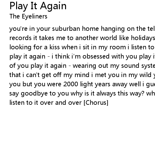 you're in your suburban home hanging on the telephone i'm in my room playing records it takes me to another world like holidays in the sun or when i am looking for a kiss when i sit in my room i listen to it over and over [Chorus] play it again - i think i'm obsessed with you play it again - i can't get enough of you play it again - wearing out my sound system play it again - that song that i can't get off my mind i met you in my wild youth that's when i fell for you but you were 2000 light years away well i guess i always knew i'd have to say goodbye to you why is it always this way? when i'm driving in my car i listen to it over and over [Chorus] |