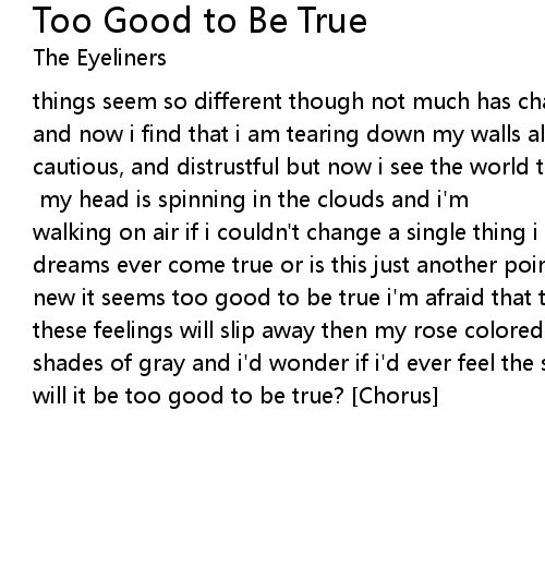 things seem so different though not much has changed at all self deconstruction and now i find that i am tearing down my walls always so cynical, careful cautious, and distrustful but now i see the world through rose colored glasses and everything is beautiful [Chorus] my head is spinning in the clouds and i'm walking on air if i couldn't change a single thing i wouldn't really care do dreams ever come true or is this just another point of view? it's beautiful and new it seems too good to be true i'm afraid that things will change and then these feelings will slip away then my rose colored world would turn to many shades of gray and i'd wonder if i'd ever feel the same again one day if i do, will it be too good to be true? [Chorus] |