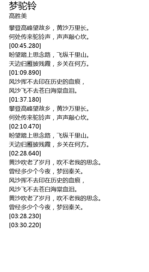 | [00:34.310] | 何处传来驼铃声,声声敲心坎。 |