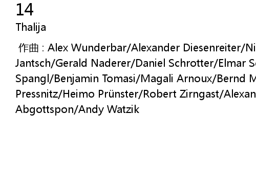 | [00:00.000] | zuo qu : Alex Wunderbar Alexander Diesenreiter Nikolaus Jantsch Gerald Naderer Daniel Schrotter Elmar Schwarzlmü ller Rainer Spangl Benjamin Tomasi Magali Arnoux Bernd Mathi Ralph Neumü ller Richard Pressnitz Heimo Prü nster Robert Zirngast Alexander Koineggg Franziska Abgottspon Andy Watzik |