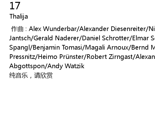 | [00:00.000] | zuo qu : Alex Wunderbar Alexander Diesenreiter Nikolaus Jantsch Gerald Naderer Daniel Schrotter Elmar Schwarzlmü ller Rainer Spangl Benjamin Tomasi Magali Arnoux Bernd Mathi Ralph Neumü ller Richard Pressnitz Heimo Prü nster Robert Zirngast Alexander Koineggg Franziska Abgottspon Andy Watzik |