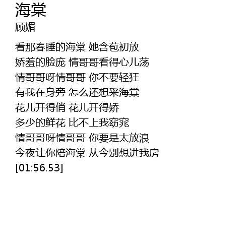 | [01:42.32] | 今夜让你陪海棠 从今别想进我房 |