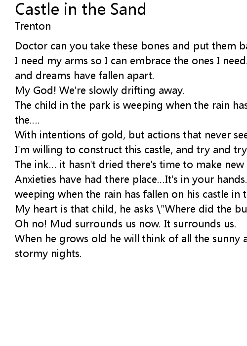 | Anxieties have had there place It' s in your hands. The child in the park is weeping when the rain has fallen on his castle in the sand. | |