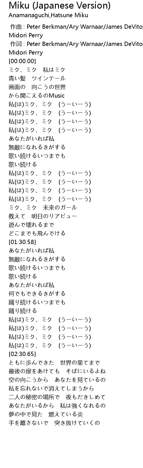 | [00:30.40] | 私(は)ミク、ミク (うーいーう) |