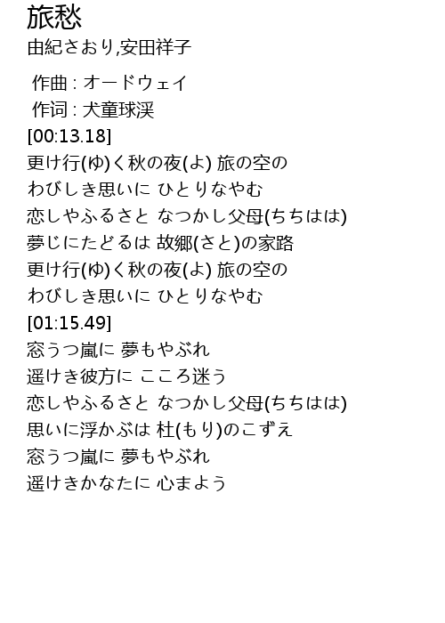 | [00:15.52] | 更け行(ゆ)く秋の夜(よ) 旅の空の |