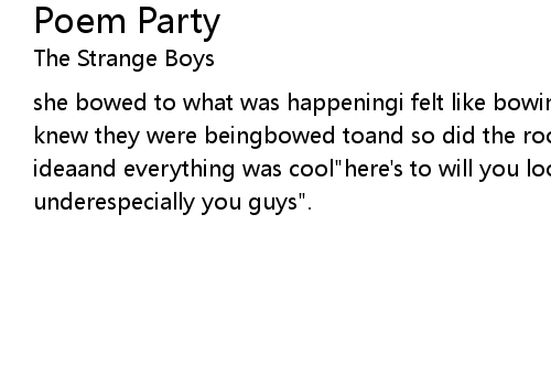 | she bowed to what was happeningi felt like bowingso we both didand the people knew they were beingbowed toand so did the roomeven the dog frankie had an ideaand everything was cool"here's to will you look at them skiesand all thats underespecially you guys". |