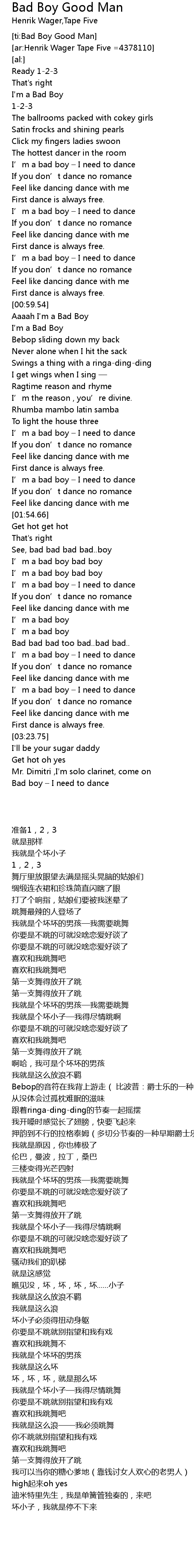 | [00:38.80] | I’m a bad boy – I need to dance |
