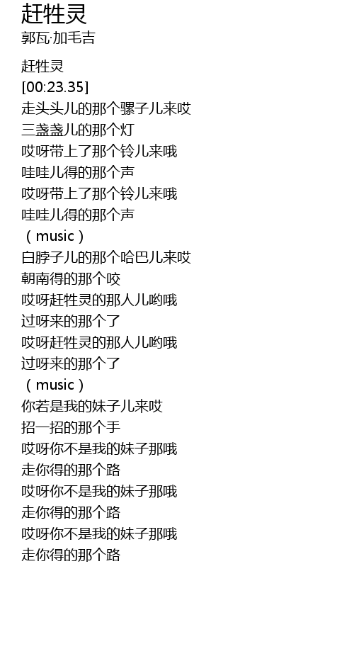 | [00:34.17] | 走头头儿的那个骡子儿来哎 |