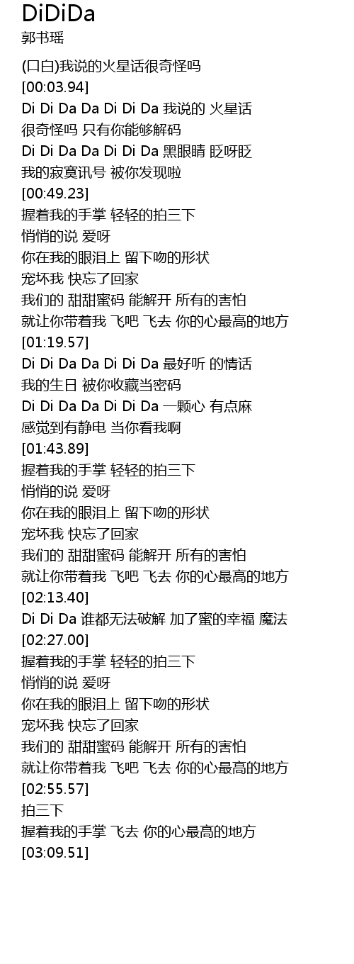 | [02:18.50] | Di Di Da 谁都无法破解 加了蜜的幸福 魔法 |