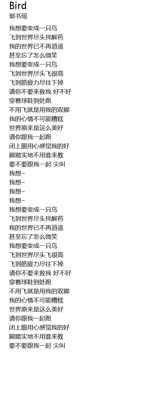 | [00:37.38] | wǒ xiǎng yào biàn chéng yì zhī niǎo |