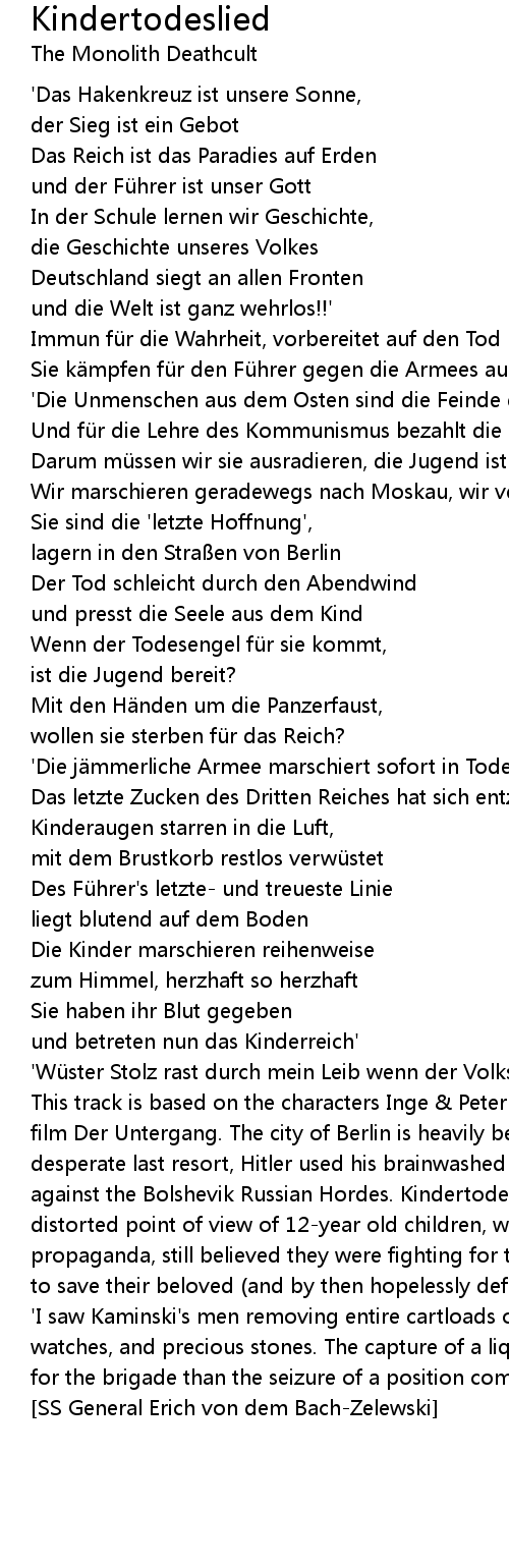 | This track is based on the characters Inge & Peter from the 2004 German/Austrian film Der Untergang. The city of Berlin is heavily besieged in May 1945. As a desperate last resort, Hitler used his brainwashed army of children to 'resist' against the Bolshevik Russian Hordes. Kindertodeslied is written from the distorted point of view of 12-year old children, who, sickened by years of propaganda, still believed they were fighting for the 'Cause', and were helping to save their beloved (and by then hopelessly defeated) Third Reich. | |