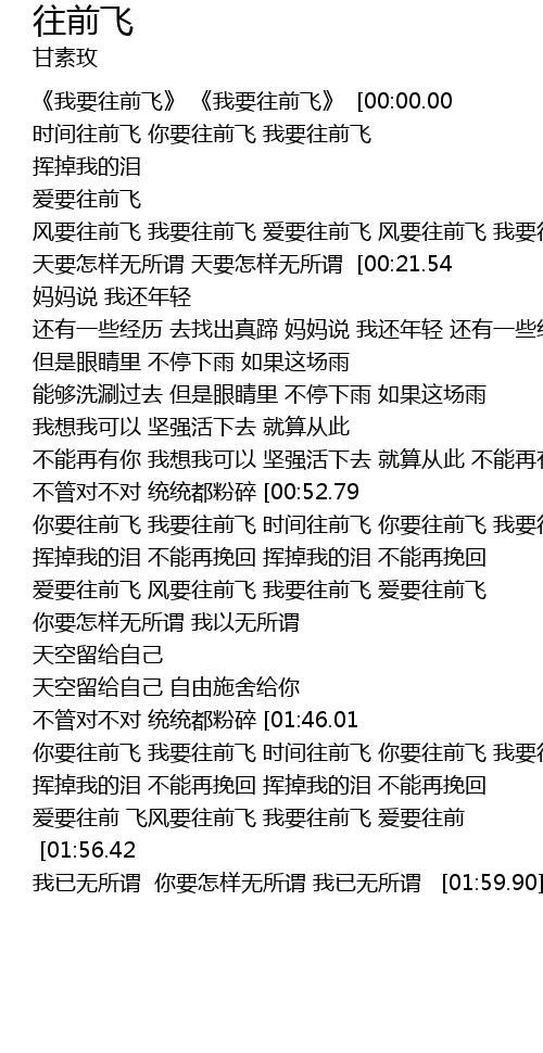 | [00:-2.00]《我要往前飞》 《我要往前飞》 [00:00.00]不管对不对 统统都粉碎 [00:04.30]时间往前飞 你要往前飞 我要往前飞 时间往前飞 你要往前飞 我要往前飞 [00:08.61]挥掉我的泪 不能再挽回 挥掉我的泪 不能再挽回 [00:12.92]爱要往前飞 风要往前飞 我要往前飞 爱要往前飞 风要往前飞 我要往前飞 [00:17.23]天要怎样无所谓 天要怎样无所谓 [00:21.54]云层里 绵沿几千里 我快不能呼吸 因为想你 [00:27.63]妈妈说 我还年轻 还有一些经历 去找出真蹄 妈妈说 我还年轻 还有一些经历 去找出真蹄 [00:33.72]但是眼睛里 不停下雨 如果这场雨 能够洗涮过去 但是眼睛里 不停下雨 如果这场雨 能够洗涮过去 [00:39.81]我想我可以 坚强活下去 就算从此 不能再有你 我想我可以 坚强活下去 就算从此 不能再有你 [00:45.90]不管对不对 统统都粉碎 [00:52.79]时间往前飞 你要往前飞 我要往前飞 时间往前飞 你要往前飞 我要往前飞 [00:59.68]挥掉我的泪 不能再挽回 挥掉我的泪 不能再挽回 [01:06.57]爱要往前飞 风要往前飞 我要往前飞 爱要往前飞 风要往前飞 我要往前飞 [01:13.46]你要怎样无所谓 我以无所谓 你要怎样无所谓 我以无所谓 [01:20.36]天空留给自己 自由施舍给你 离我远点 [01:31.45]天空留给自己 自由施舍给你 离我远点 [01:42.54]不管对不对 统统都粉碎 [01:46.01]时间往前飞 你要往前飞 我要往前飞 时间往前飞 你要往前飞 我要往前飞 [01:49.48]挥掉我的泪 不能再挽回 挥掉我的泪 不能再挽回 [01:52.95]爱要往前 飞风要往前飞 我要往前飞 爱要往前 飞风要往前飞 我要往前飞 [01:53:00] [01:56.42]你要怎样无所谓 我已无所谓 你要怎样无所谓 我已无所谓 [01:59.90] |