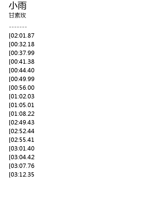| [02:19.98][00:44.40] | 小雨啊~你甘搁会记 |