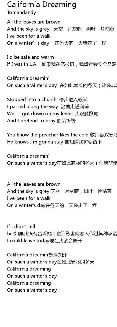 | California dreamin' xiǎng niàn jiā zhōu | |