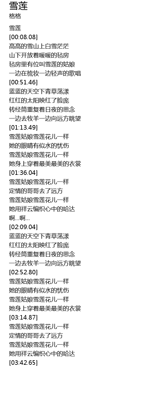 | [03:04.02] | 雪莲姑娘雪莲花儿一样 |