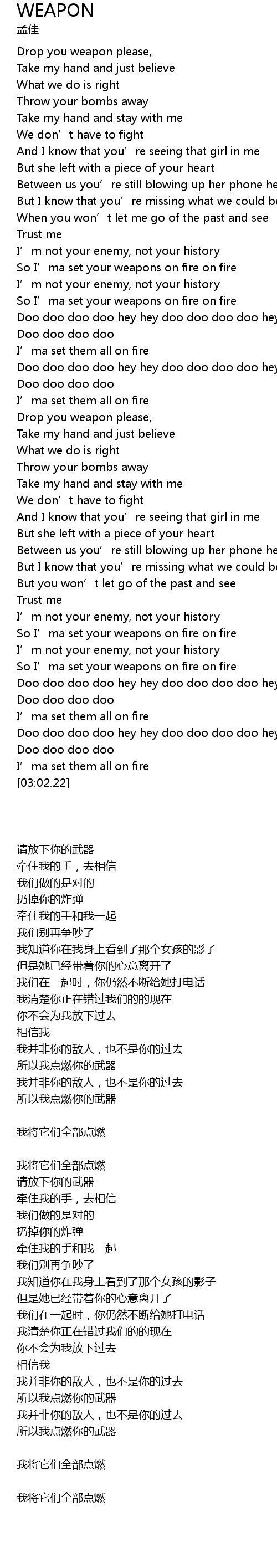 | [02:31.75] | So I’ma set your weapons on fire on fire |