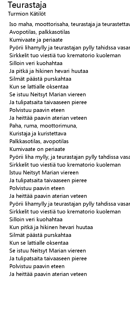 | [01:06.581] | Sirkkelit tuo viesti tuo krematorio kuoleman |
