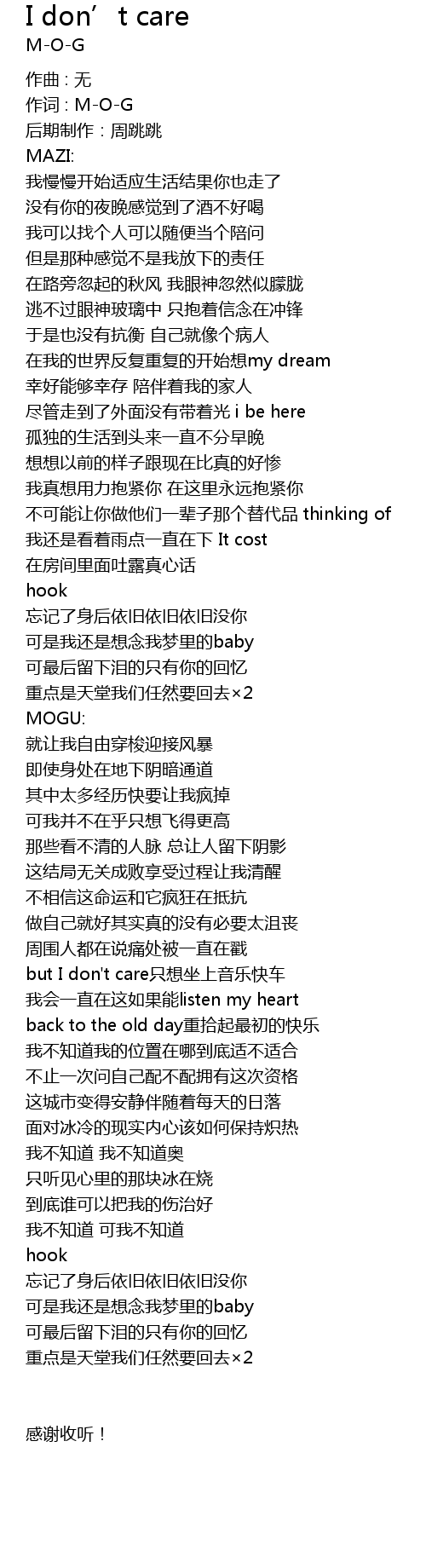 | but I don' t care zhǐ xiǎng zuò shàng yīn yuè kuài chē | |