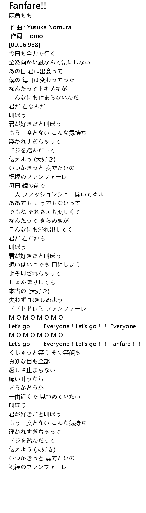 | [02:28.963] | Let' s go!! Everyone! Let' s go!! Fanfare!! |