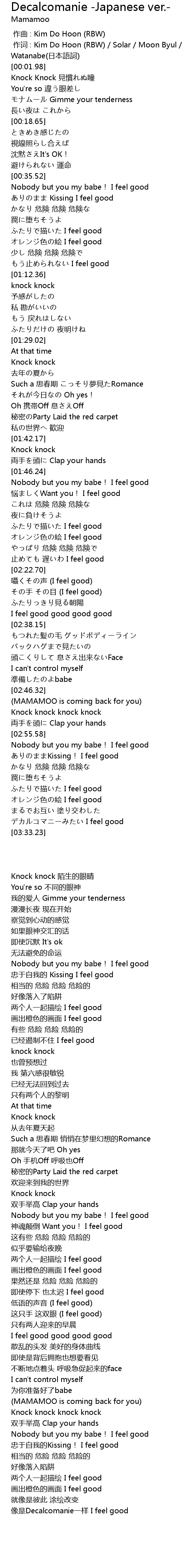 | [00:00.366] | 作词 : Kim Do Hoon (RBW) / Solar / Moon Byul / Hwa Sa / Natsumi Watanabe(日本語詞) |