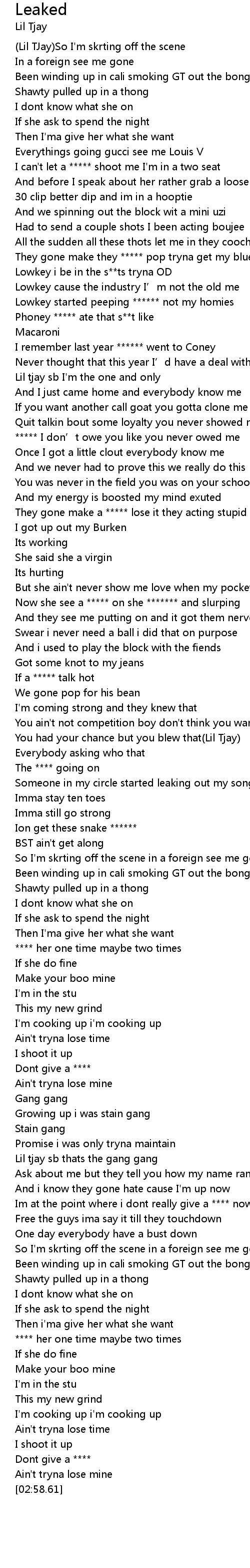 | [00:43.29] | Lowkey started peeping ****** not my homies |