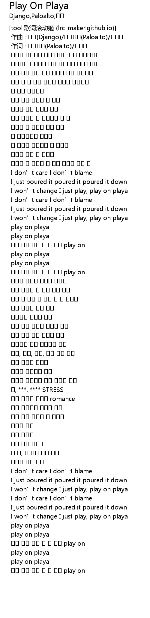 | [00:55.412] | I won’t change I just play, play on playa |