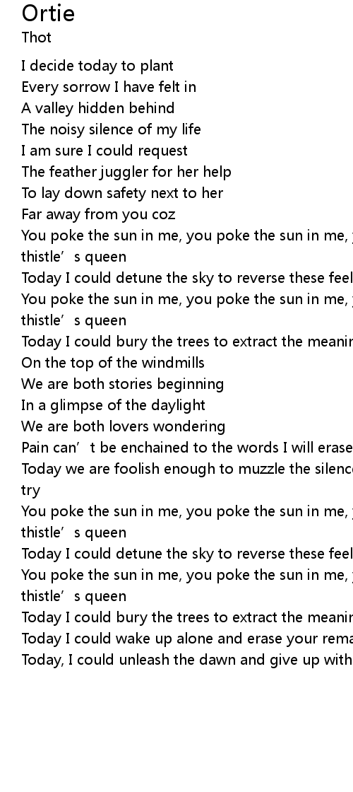 | You poke the sun in me, you poke the sun in me, you poke the sun in me like a thistle' s queen | |