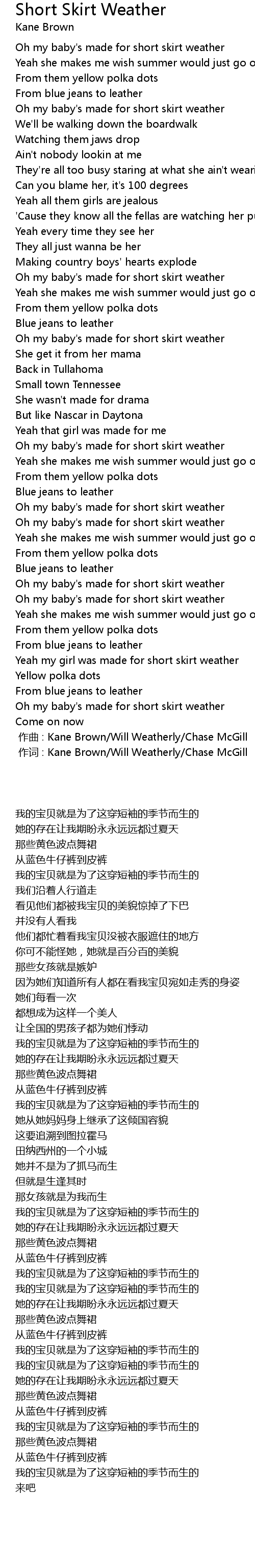 | [02:19] | Oh my baby' s made for short skirt weather |