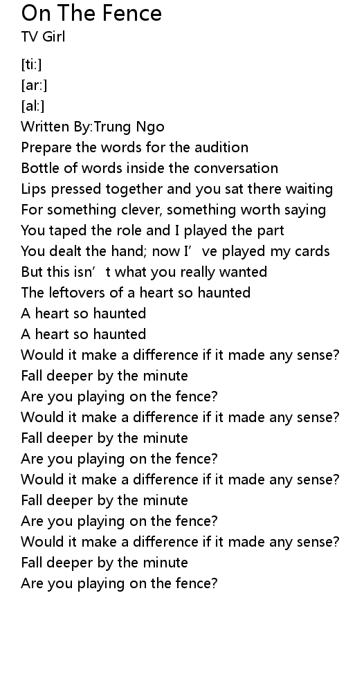 | [01:18.06] | Are you playing on the fence? |