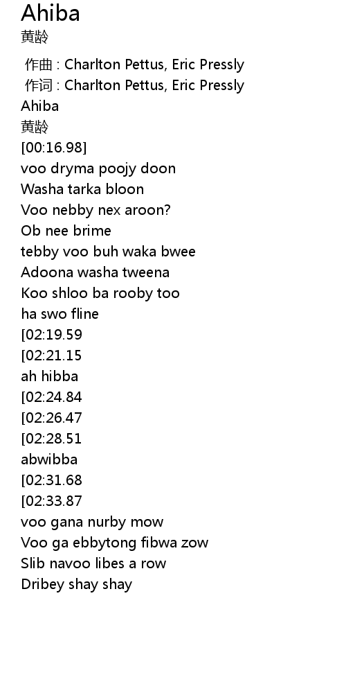 | [02:46.99][02:31.68][01:44.02][01:27.90][00:49.81] | Vooba doo a fibawib voo |