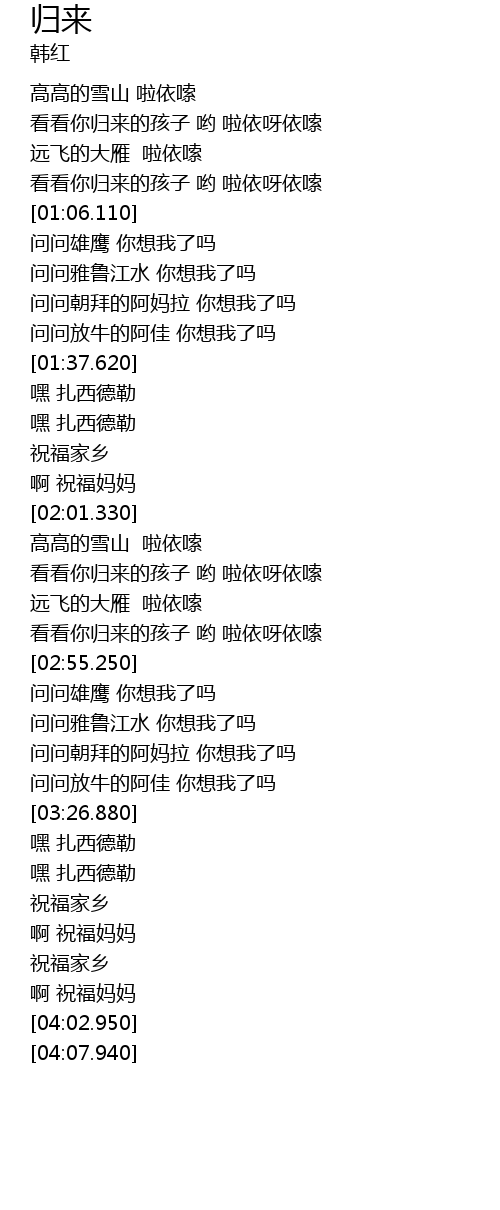 | [00:58.370] | 看看你归来的孩子 哟 啦依呀依嗦 |