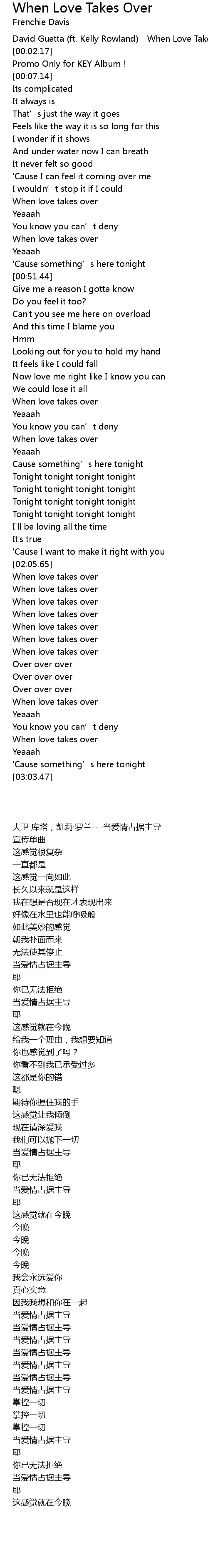 | [00:00.59] | David Guetta (ft. Kelly Rowland) - When Love Takes Over |
