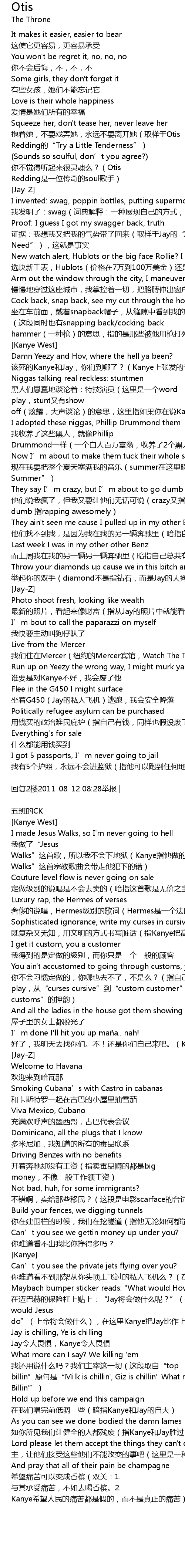 | 该死的Kanye和Jay,你们到哪了?(Kanye上张发的专辑是在2010,Jay的是2009,在这里指他们消失了去录这张专辑) | |