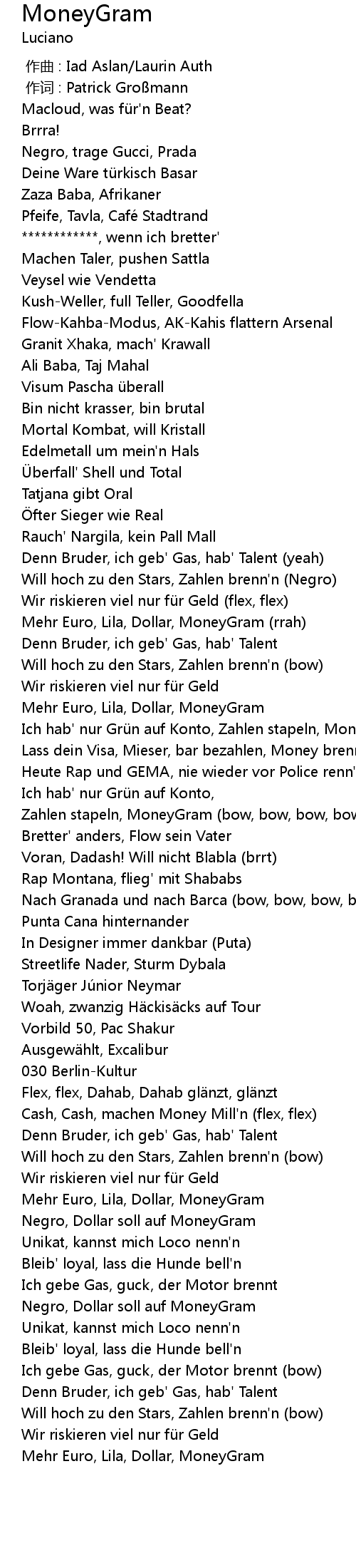 | [01:00.72] | Ich hab' nur Grü n auf Konto, Zahlen stapeln, MoneyGram brrt |