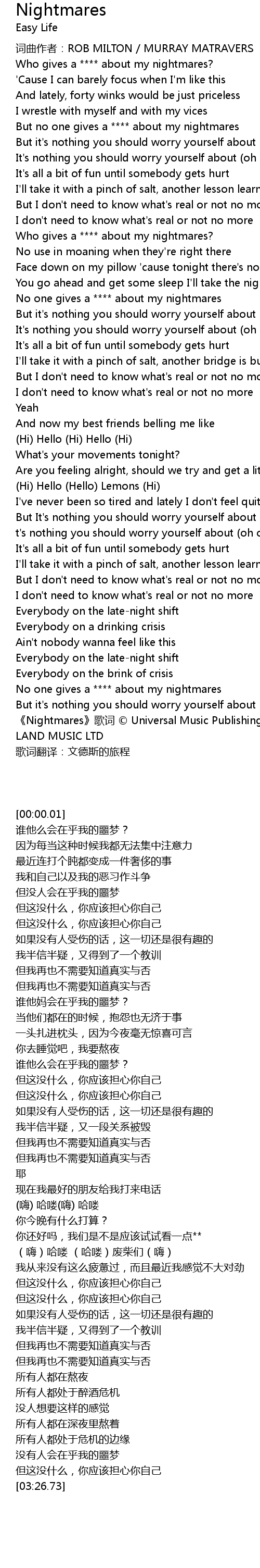 | [03:26.73] | 《Nightmares》歌词 © Universal Music Publishing Ltd., PROMISED LAND MUSIC LTD |