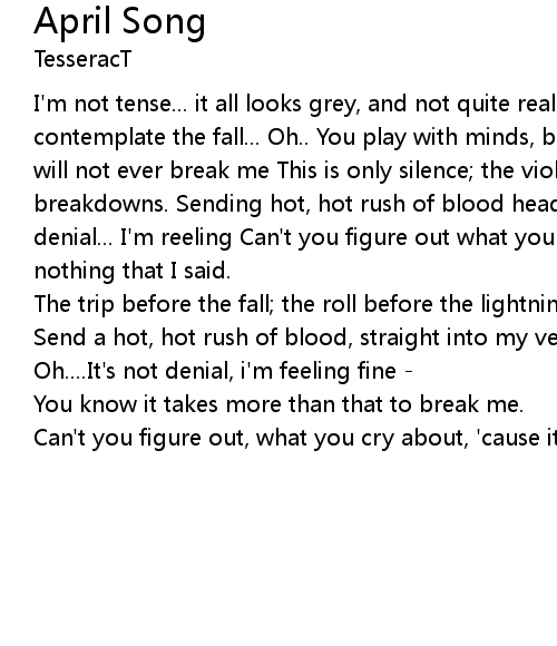 | I'm not tense... it all looks grey, and not quite real... From my ledge I contemplate the fall... Oh.. You play with minds, but I feel fine - You know you will not ever break me This is only silence; the violent space between the breakdowns. Sending hot, hot rush of blood heading to the vein. It's not denial... I'm reeling Can't you figure out what you cry about, cause it's nothing that I said. | |