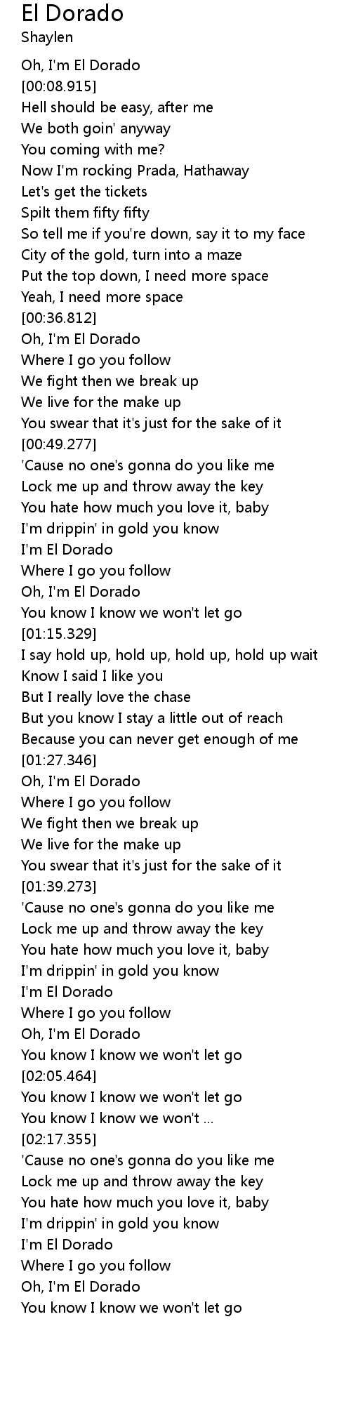 | [00:36.963] | Oh, I'm El Dorado |