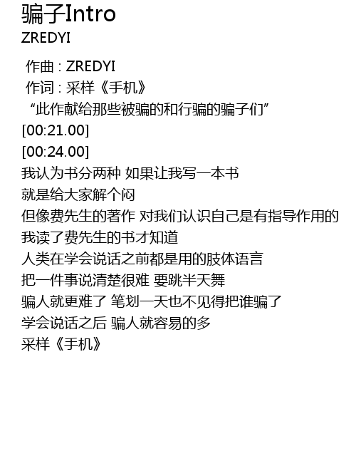 | [00:20.00] | “此作献给那些被骗的和行骗的骗子们” |