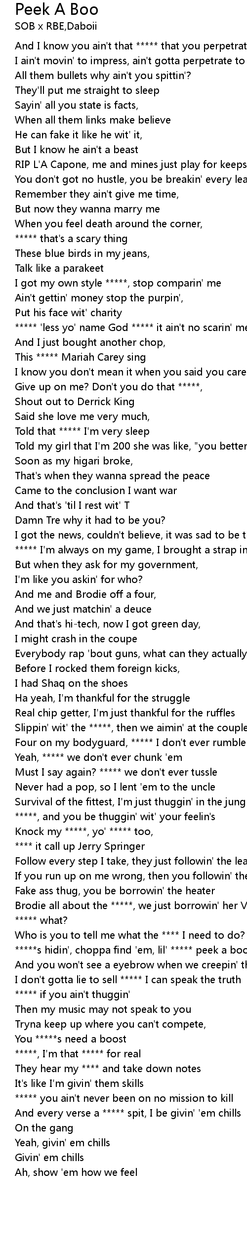 | [01:51.51] | *****s hidin', choppa find 'em, lil' ***** peek a boo |