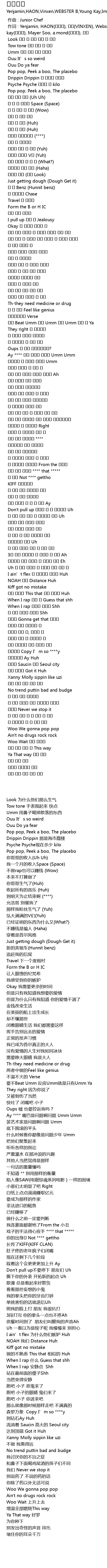 | [00:01.000] | 作词 : Yenjamin, HAON(김하온), 빈첸(VINXEN), Webster B, Young kay(김민규), Mayer Soo, a.mond(방재민), 조웅 |
