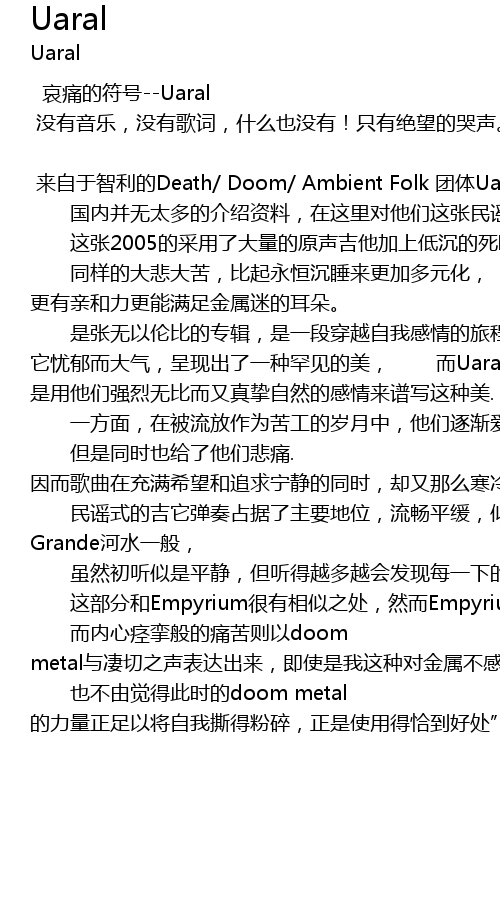 | lái zì yú zhì lì de Death Doom Ambient Folk tuán tǐ Uaral, chéng lì yú 1996 nián, guó nèi bìng wú tài duō de jiè shào zī liào, zài zhè lǐ duì tā men zhè zhāng mín yáo yīn yuè zhōng de diān fēng zuò pǐn lüè zuò tuī jiàn. zhè zhāng 2005 de cǎi yòng le dà liàng de yuán shēng jí tā jiā shang dī chén de sǐ sǎng, qīng xīn chóu chàng ér jué wàng, tóng yàng de dà bēi dà kǔ, bǐ qǐ yǒng héng chén shuì lái gèng jiā duō yuán huà, gèng yǒu qīn hé lì gèng néng mǎn zú jīn shǔ mí de ěr duǒ. shì zhāng wú yǐ lún bǐ de zhuān jí, shì yī duàn chuān yuè zì wǒ gǎn qíng de lǚ chéng. tā yōu yù ér dà qì, chéng xiàn chū le yī zhǒng hǎn jiàn de měi, ér Uaral shì yòng tā men qiáng liè wú bǐ ér yòu zhēn zhì zì rán de gǎn qíng lái pǔ xiě zhè zhǒng měi. yī fāng miàn, zài bèi liú fàng zuò wéi kǔ gōng de suì yuè zhōng, tā men zhú jiàn ài shàng le zhè kuài tǔ dì, tā gěi le tā men jiā, gěi le tā men xī wàng, dàn shì tóng shí yě gěi le tā men bēi tòng. yīn ér gē qǔ zài chōng mǎn xī wàng hé zhuī qiú níng jìng de tóng shí, què yòu nà me hán lěng ér yā yì. mín yáo shì de jí tā tán zòu zhàn jù le zhǔ yào dì wèi, liú chàng píng huǎn, shì rú tā men suǒ jīng cháng pái huái yú qí biān de Potrero Grande hé shuǐ yì bān, suī rán chū tīng shì shì píng jìng, dàn tīng dé yuè duō yuè huì fā xiàn měi yī xià de bō xián dōu zài zhèn dàng zhe nèi xīn. zhè bù fèn hé Empyrium hěn yǒu xiāng sì zhī chù, rán ér Empyrium bǐ zhī Uaral yào píng hé dé duō, zhè shì bù tóng mìng yùn de qū bié ba ér nèi xīn jìng luán bān de tòng kǔ zé yǐ doom metal yǔ qī qiè zhī shēng biǎo dá chū lái, jí shǐ shì wǒ zhè zhǒng duì jīn shǔ bù gǎn xīng qù de rén, yě bù yóu jué de cǐ shí de doom metal de lì liàng zhèng zú yǐ jiāng zì wǒ sī dé fěn suì, zhèng shì shǐ yòng dé qià dào hǎo chù" |